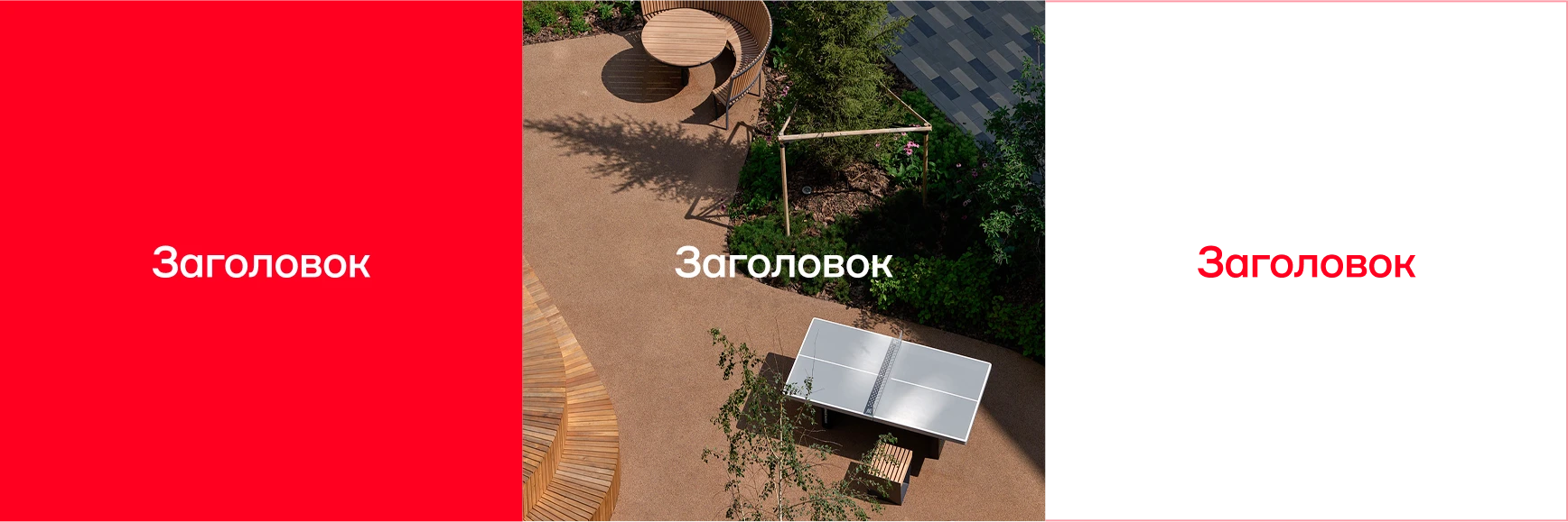 На красном и тёмном фоне типографика белая, на белом фоне — красная. При размещении текста на фото выбирайте более контрастную опцию.